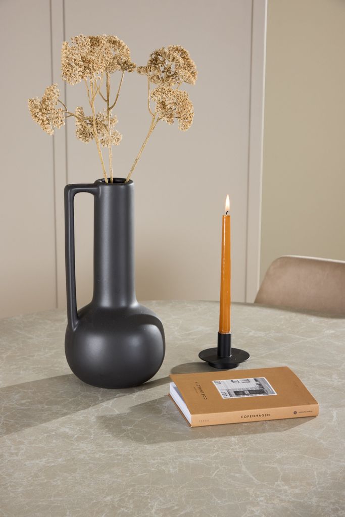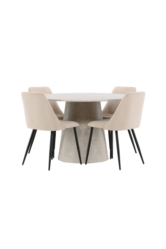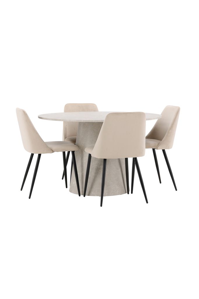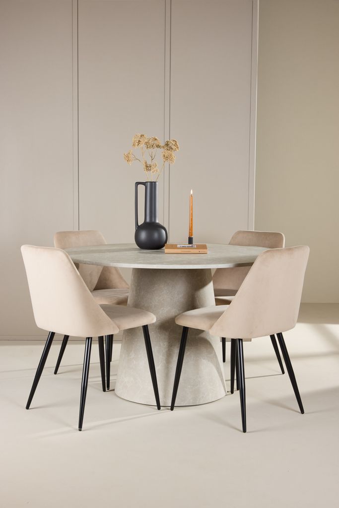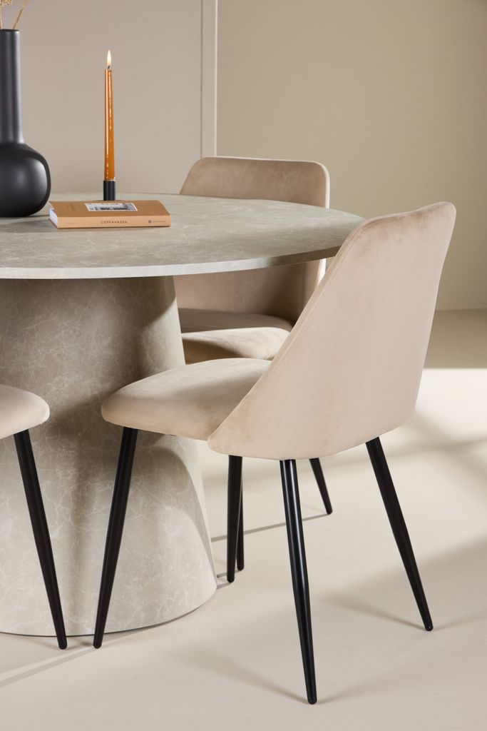 Tillsammans med bordet kommer matstolen Night, en elegant och bekväm stol klädd i mjuk beige sammet som ger en inbjudande sittupplevelse. De svarta benen ger en stilren kontrast till den ljusa sitsen. Stolen har en ergonomisk design som ger bra stöd för ryggen, perfekt för långa middagar. Kombinationen av den lyxiga sammeten och de svarta benen ger stolen en balanserad och modern look.