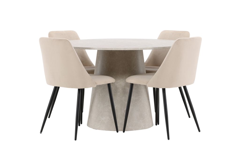 Matbordet Lanzo erbjuder en sofistikerad och exklusiv känsla med sin vackra beige marmorerade yta, som efterliknar naturstenens tidlösa skönhet. Den runda formen uppmuntrar till gemenskap, vilket gör det enkelt för alla runt bordet att delta i samtal. Ytan är slät och lätt att rengöra, vilket gör den idealisk för både vardagsbruk och festliga tillställningar.