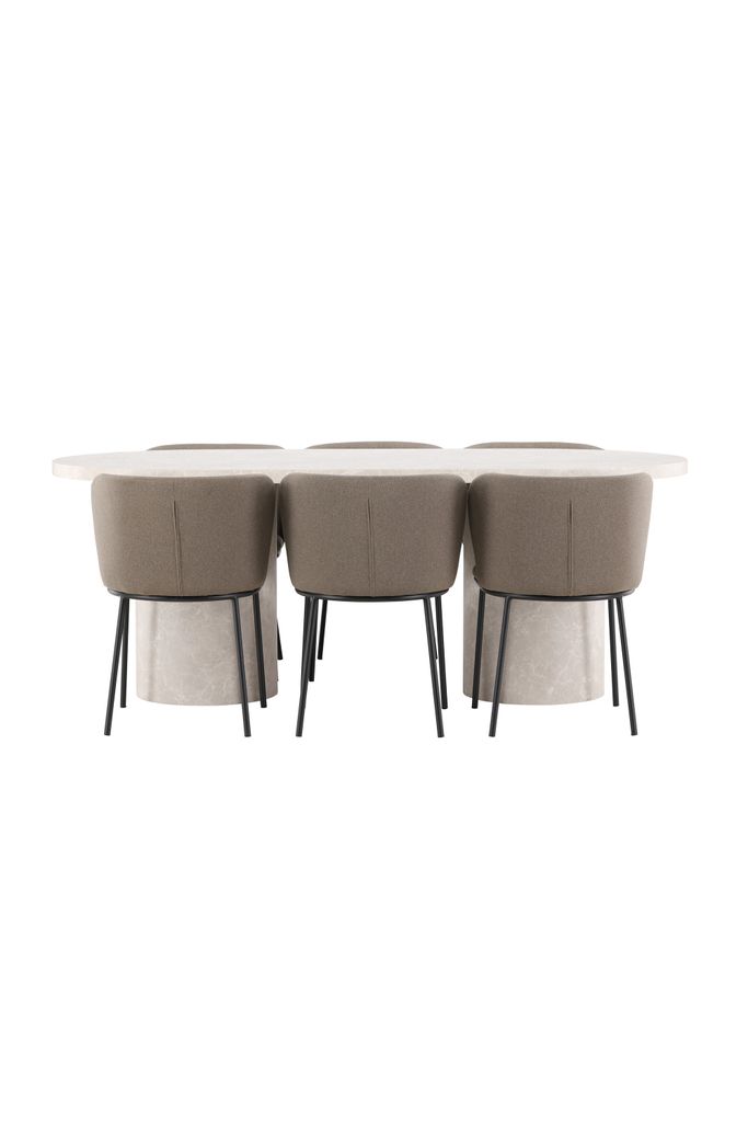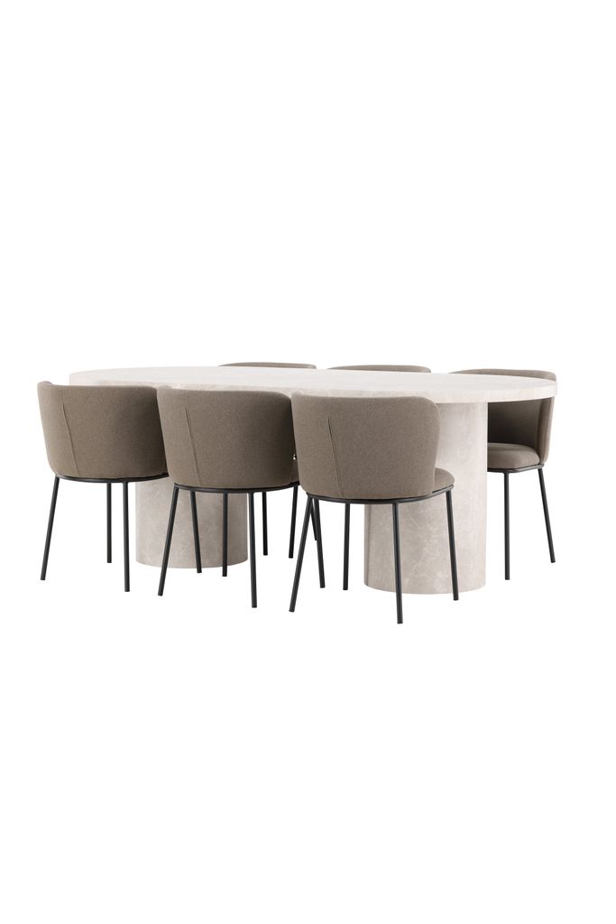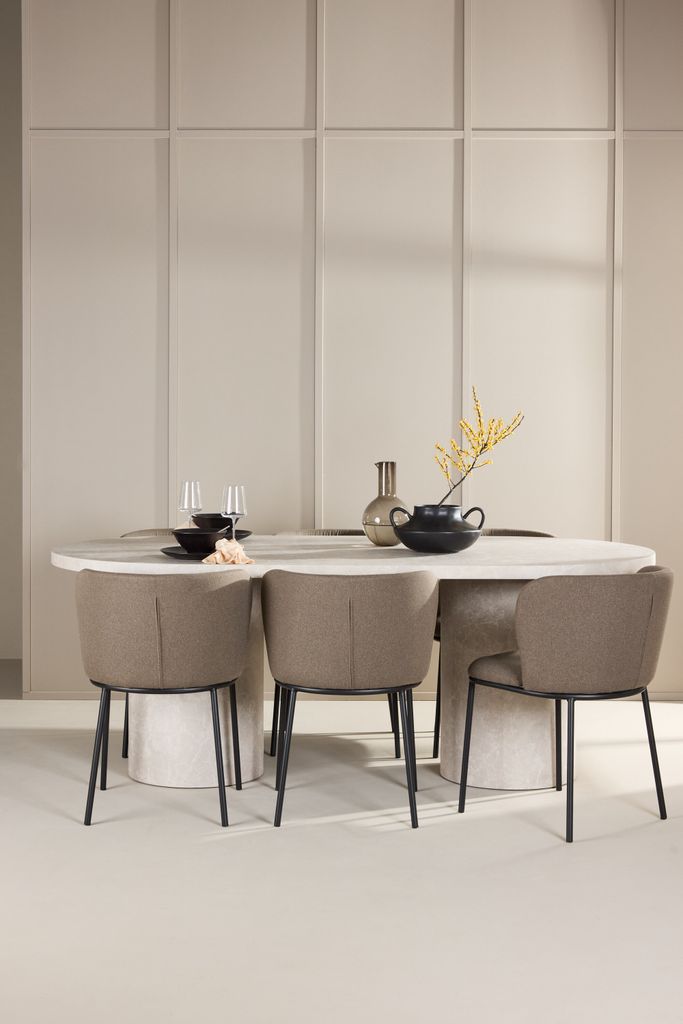 Förvandla din matplats med den stiliga och funktionella kombinationen av matbordet Narvik och matstolen Edina. Här möts elegans och komfort i en harmonisk design. Matbordet Narvik har en imponerande marmoryta i mjuk beige som ger en tidlös och sofistikerad estetik. Bordet mäter 100x200 cm, perfekt för både vardagsmiddagar och större sammankomster, med en slät yta som är lätt att rengöra.