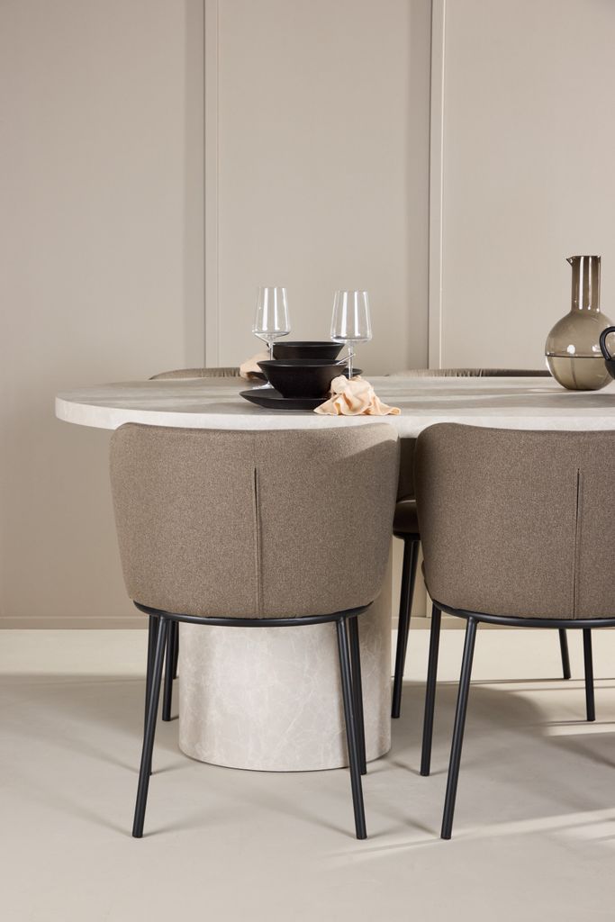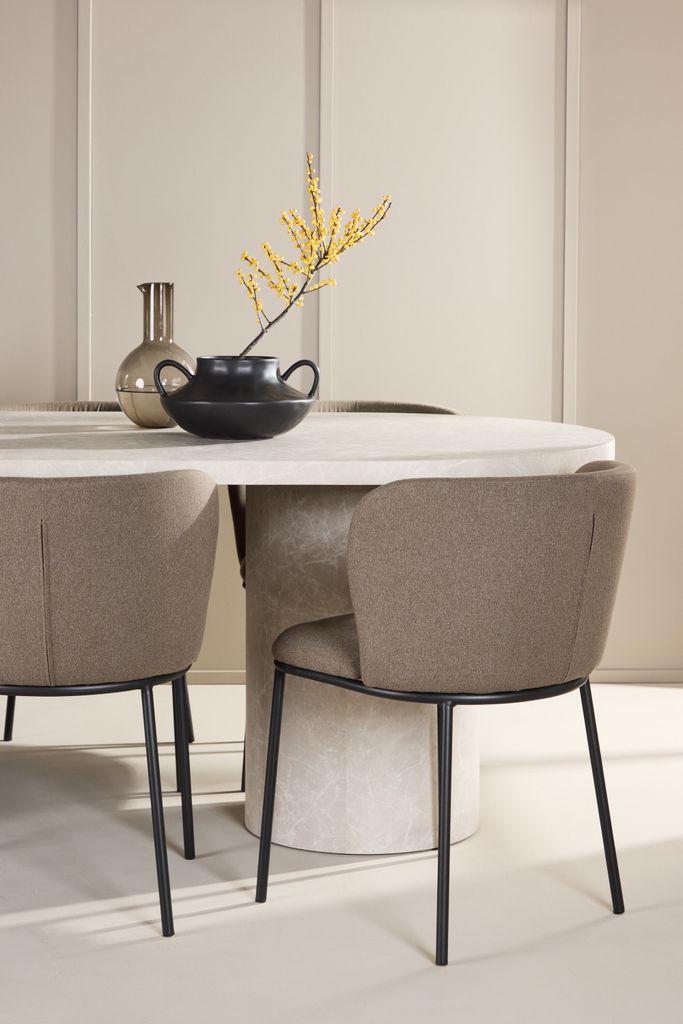 De medföljande Edina-stolarna är klädda i vackert brunt linnetyg som ger en rustik och inbjudande känsla. Den varma, bruna tonen adderar jordnära elegans till din matplats. Stolarna är designade med ergonomisk form för extra komfort under långa middagar.