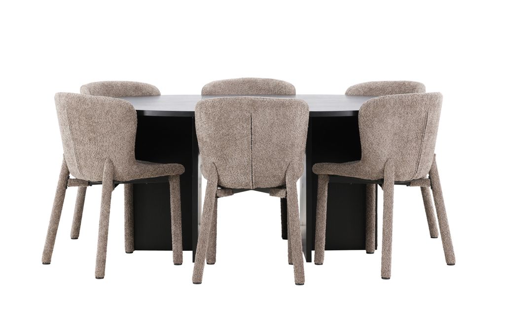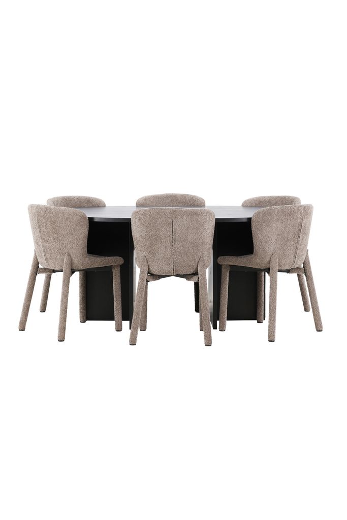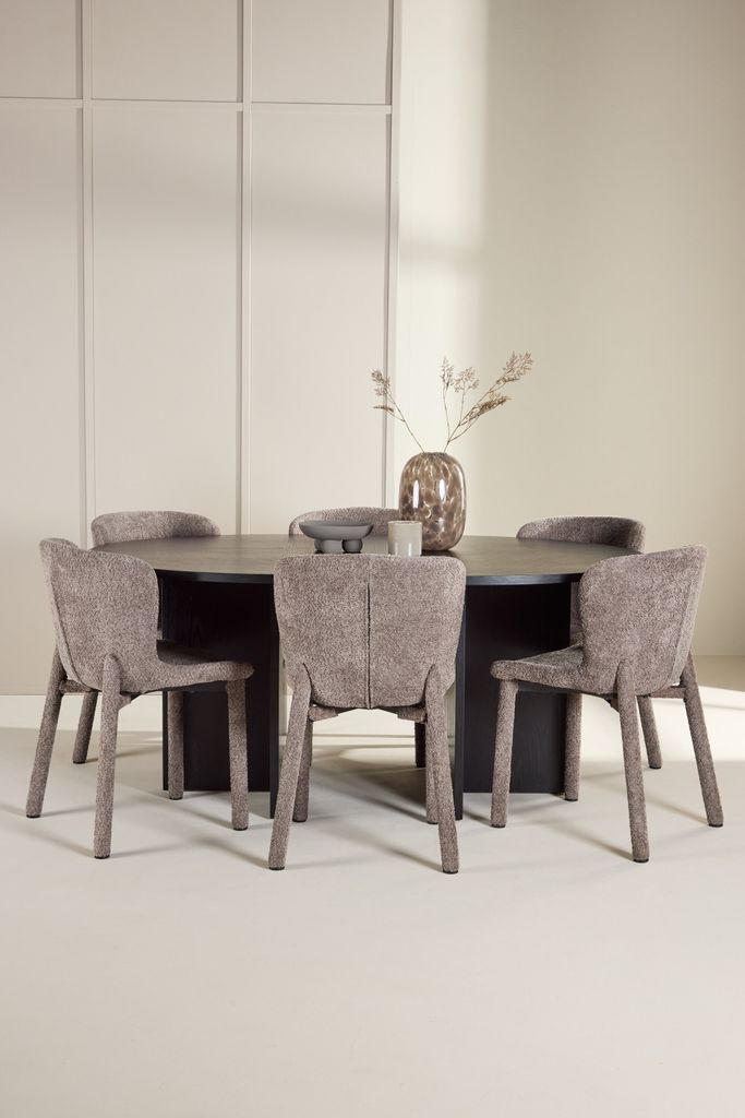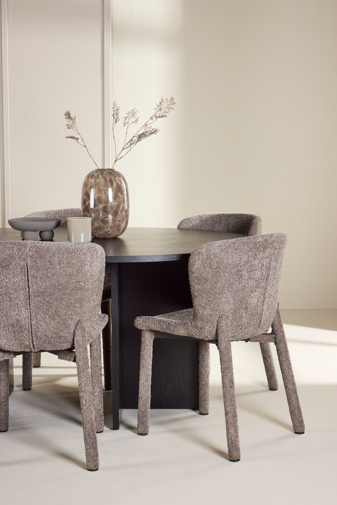 Skapa en elegant och inbjudande matplats med denna vackra kombination av Venture Home Matbord Strada och Astoria Stol. Matstolen Astoria, klädd i elegant brun bouclé, erbjuder en lyxig och omfamnande känsla. Den mjuka, texturerade ytan kompletterar elegant bordets stilrena svarta fanerträ.