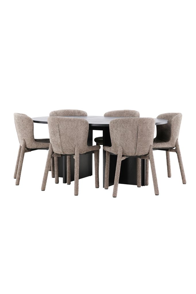 Elegant matplats med Strada bord i svart faner och Astoria stol i brun bouclé. Tidlös design och komfort.