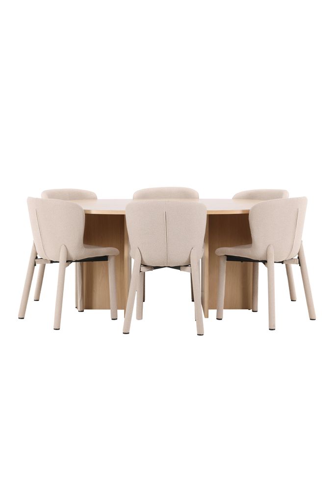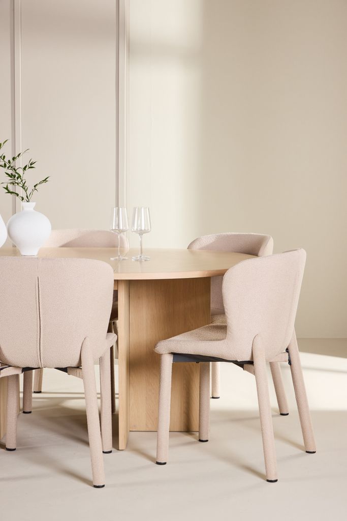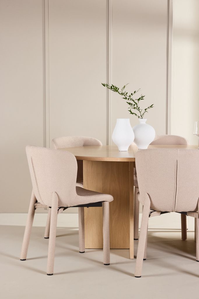 Sofistikerad matplats med Astoria-stol i beige bouclé och Strada-bord i vittvättad fanerträ. Flexibel och elegant.