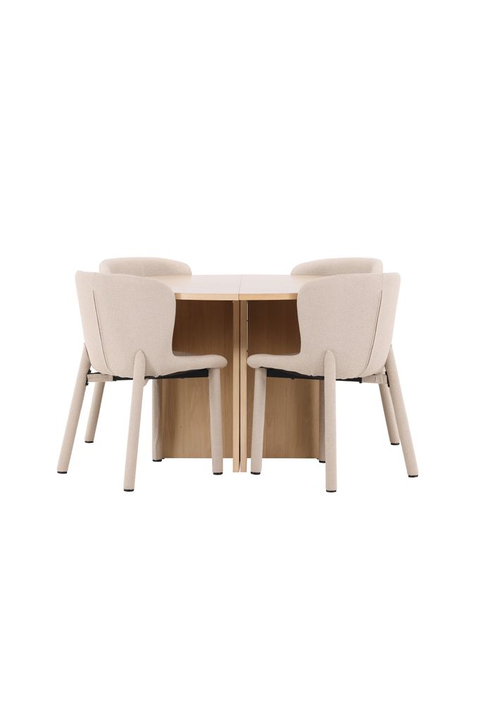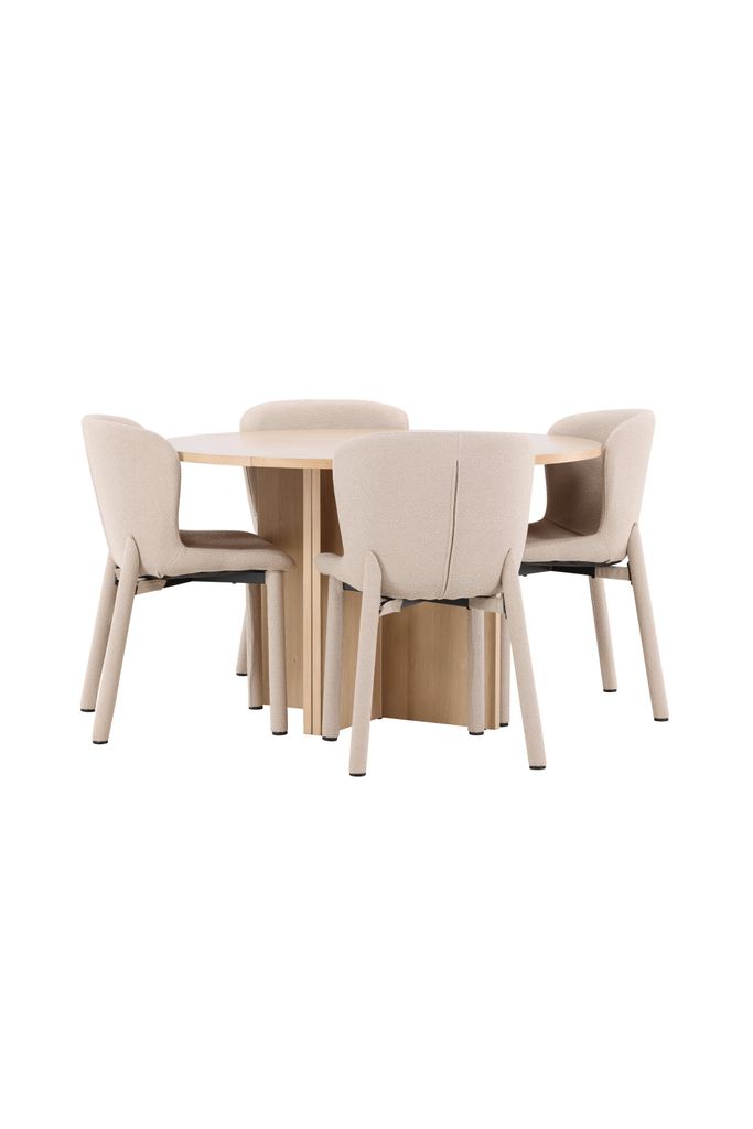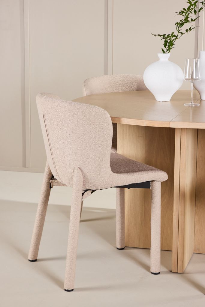 Elegant matplats med Astoria stol i beige bouclé och Strada bord i vittvättat fanerträ. Komfort och stil förenas.