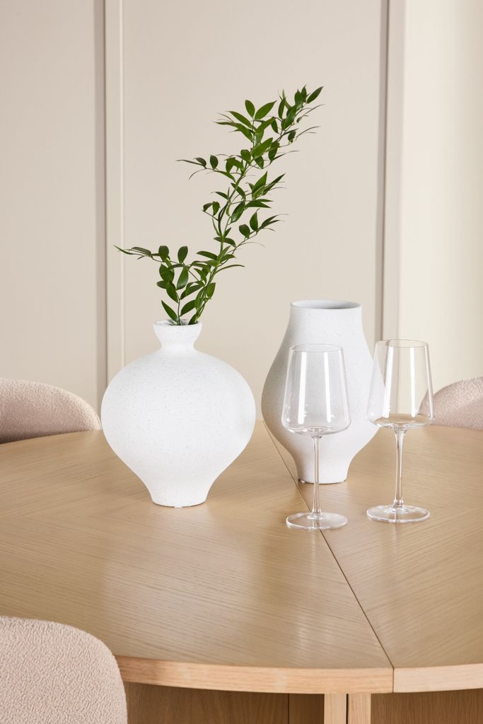 Matbordet Strada är tillverkat i vittvättat fanerträ och kombinerar tidlös estetik med praktisk funktion. Bordet har en diameter på 120 cm, perfekt för vardagsmåltider, men kan enkelt förlängas till 170 cm när fler gäster ska samlas. Den ljusa fanerytan framhäver träets naturliga struktur och ger rummet en luftig och harmonisk känsla.