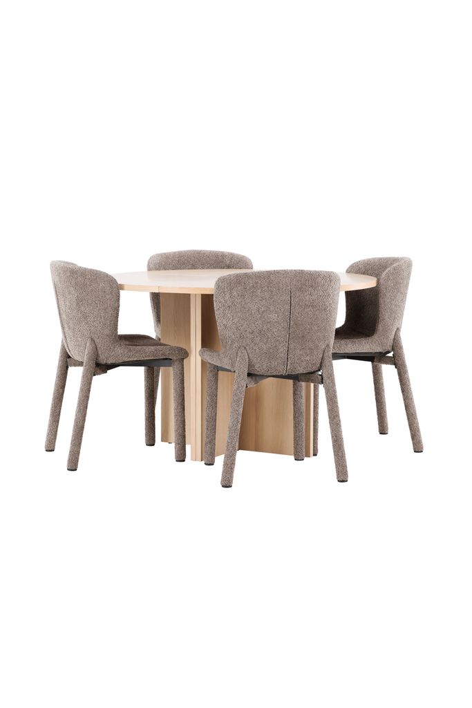 Elegant matplats med Astoria-stol i brun bouclé och Strada-bord i vittvättat fanerträ. Perfekt balans mellan komfort och stil.