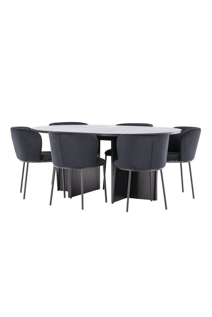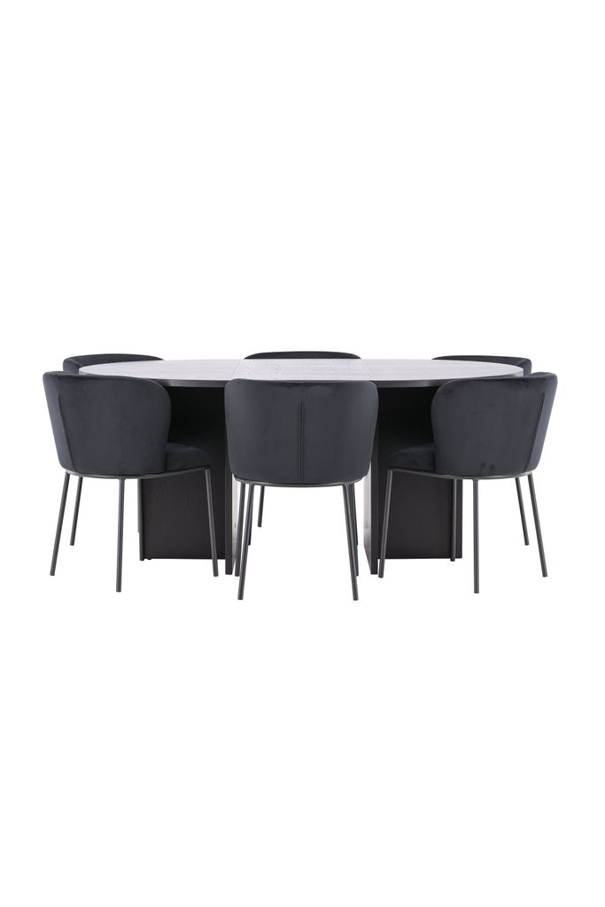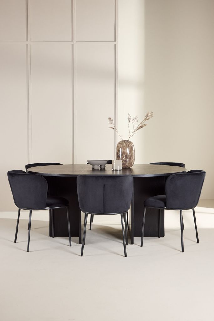 Tillsammans erbjuder matbordet Strada och Edina stolarna en harmonisk och stilren miljö, vilket gör varje måltid till en elegant upplevelse. Kombinationen av svart fanerträ och lyxig sammet utstrålar en sofistikerad elegans som gör ditt matrum till hemmets hjärta.