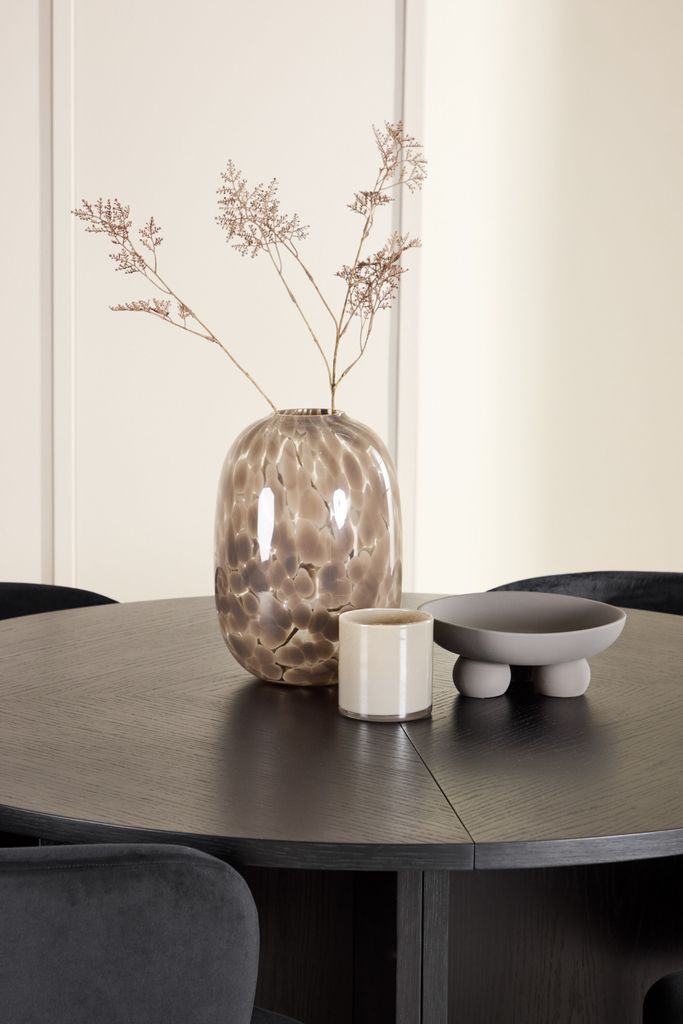 Matbordet Strada är tillverkat i svart fanerträ, vilket ger en modern och tidlös känsla. Med en diameter på 120 cm passar det perfekt för mindre måltider, men kan enkelt förlängas till 170 cm när du behöver mer plats för gäster. Bordets förlängningsfunktion är enkel att använda och ger dig både flexibilitet och stil. Den svarta fanerträkonstruktionen framhäver bordets rena linjer och eleganta design, vilket gör det till ett mångsidigt val som passar många inredningsstilar, från minimalistisk till klassisk.