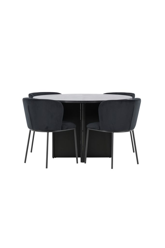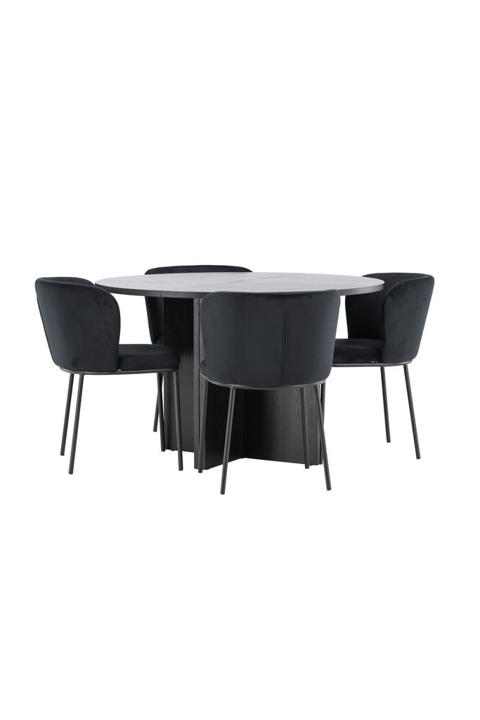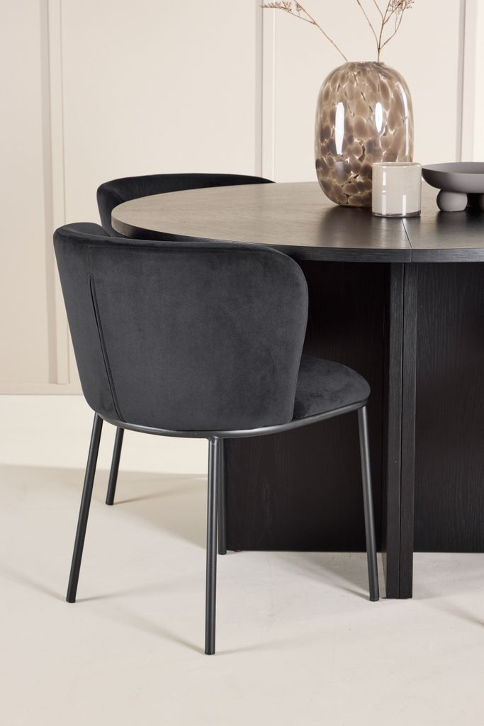 Matstolarna Edina är klädda i lyxig svart sammet som ger en rik och inbjudande känsla. Den djupa svarta nyansen tillför en touch av glamour, och den mjuka sammetsytan gör stolen extra bekväm. Stolarna är designade med både estetik och ergonomi i åtanke, vilket gör dem perfekta för både vardagliga måltider och sociala tillställningar.
