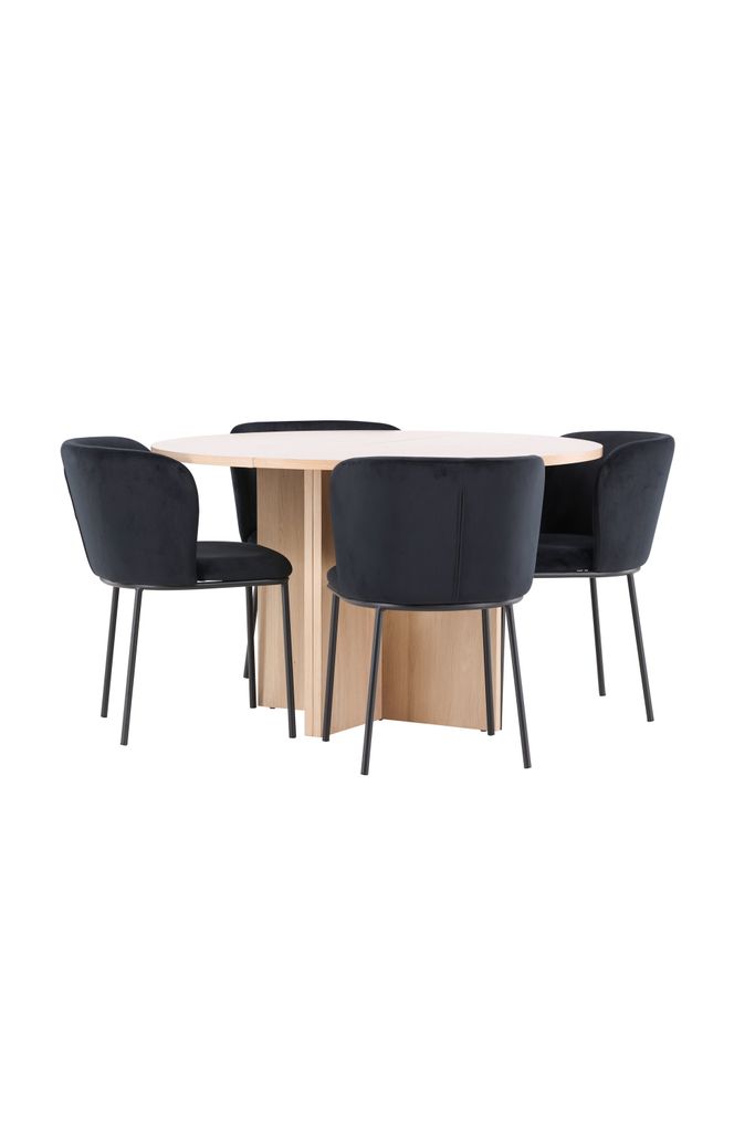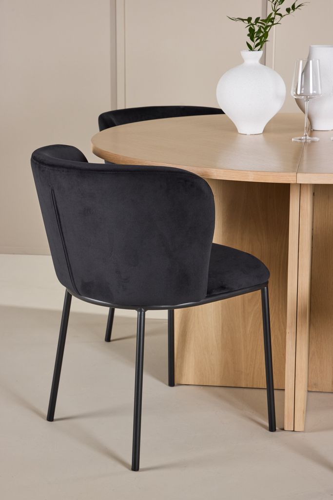 Tillsammans skapar Edina och Strada en elegant och funktionell matgrupp som harmoniserar med alla inredningsstilar. Låt kontrasten mellan den svarta sammetsklädseln och den ljusa träytan förvandla ditt matrum.