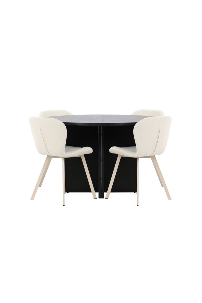Elegant matgrupp med svart matbord och beige stolar för en stilfull och flexibel matplats.