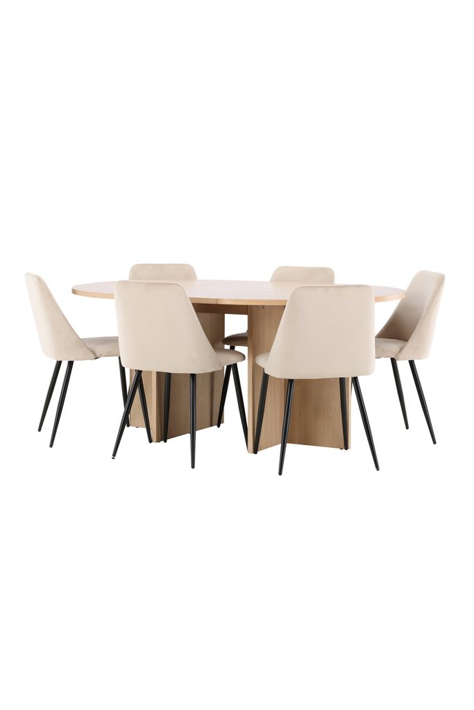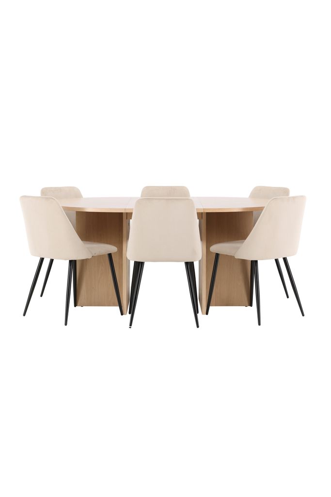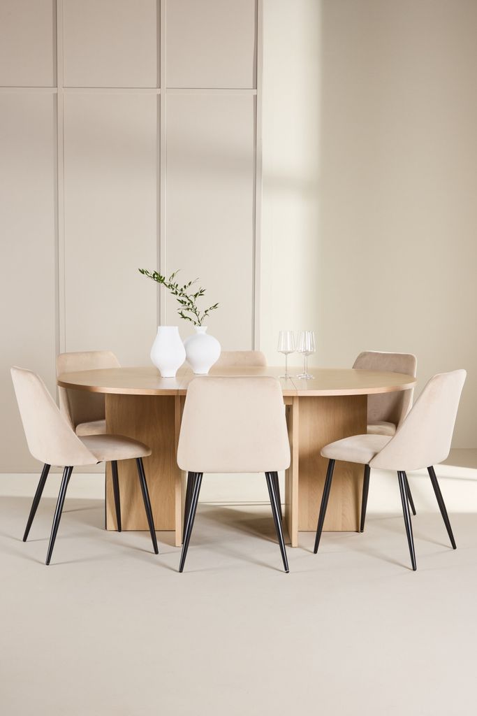 Skapa en elegant matplats med Strada bord och Night stolar i beige sammet och svart metall.