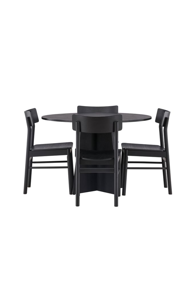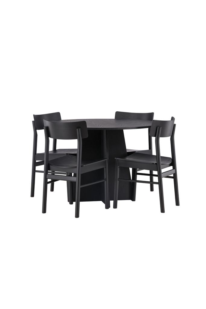 Bootcut matbord och Montros stolar erbjuder stil och funktionalitet med elegant svart MDF och björkdesign.