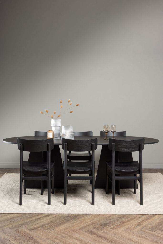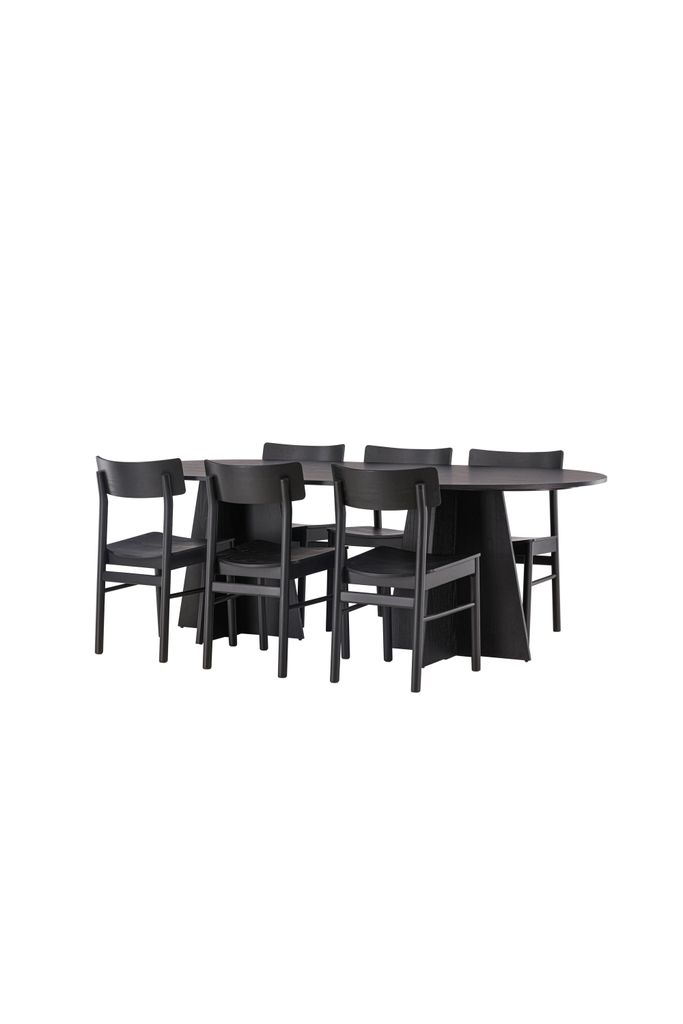 Elegant matgrupp med Bootcut-bord och Montros-stolar i svart, perfekt för stil och funktionalitet.