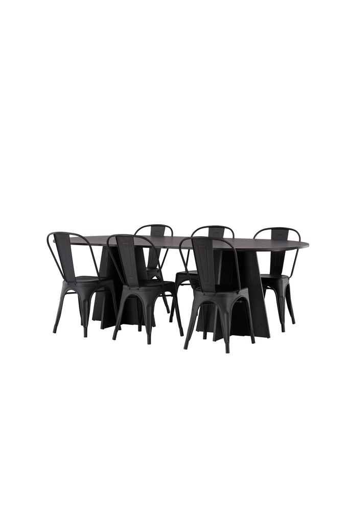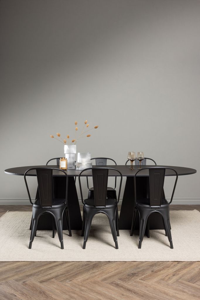 Eleganta och praktiska: ovalt matbord i svart MDF med matchande stolar i svart metall. Perfekt för stilfulla middagar.