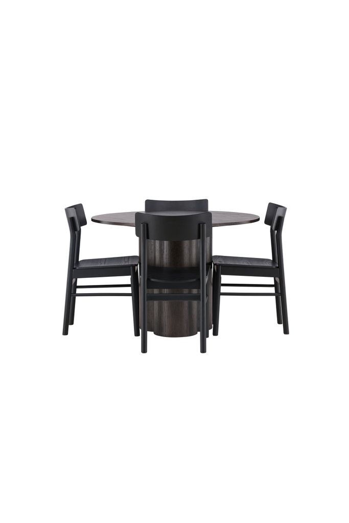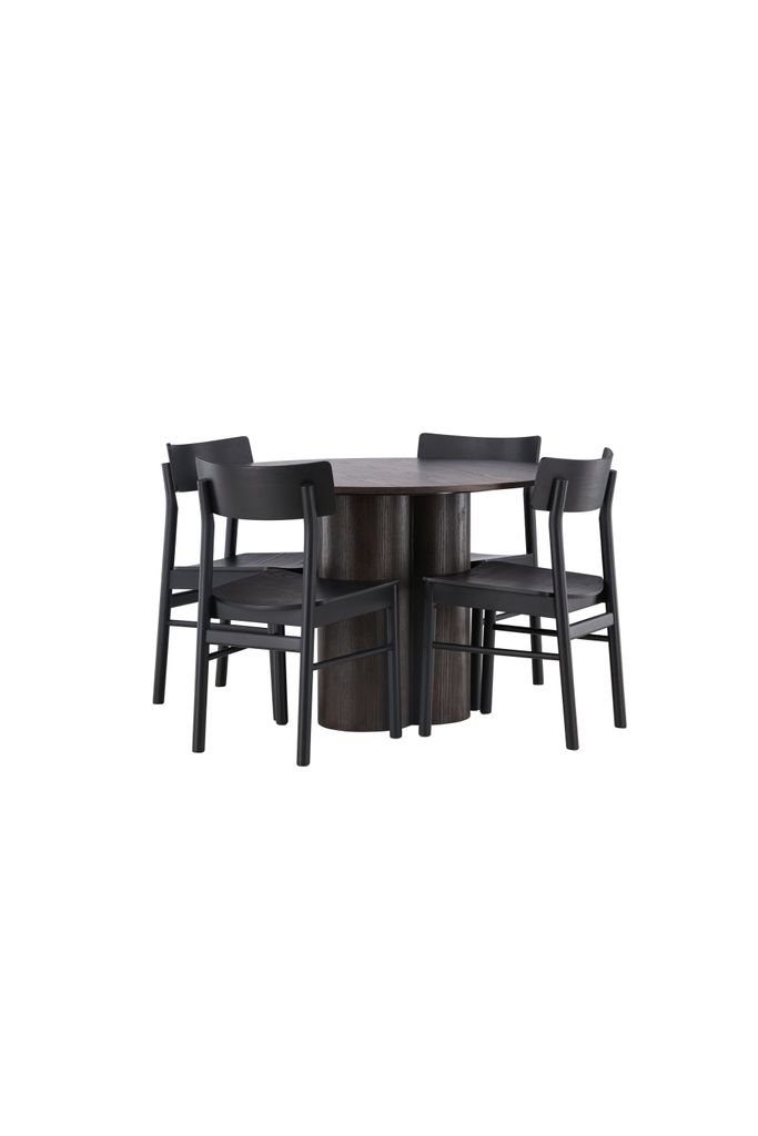 Elegant matgrupp med Olivia-bord i moccafärg och svarta Montros-stolar i björk. Perfekt för alla tillfällen.