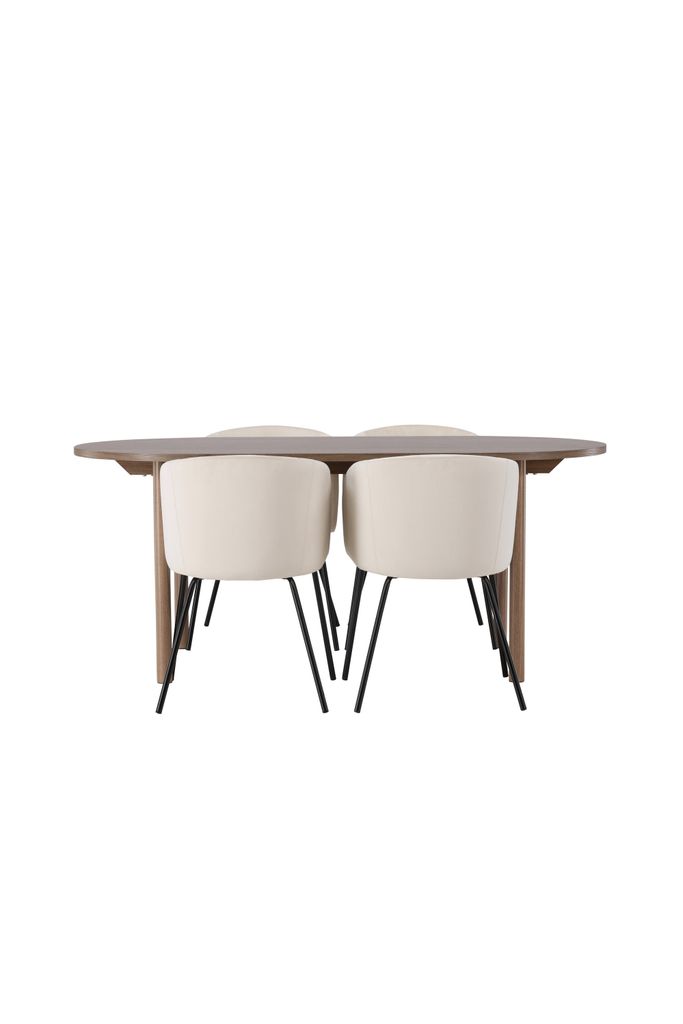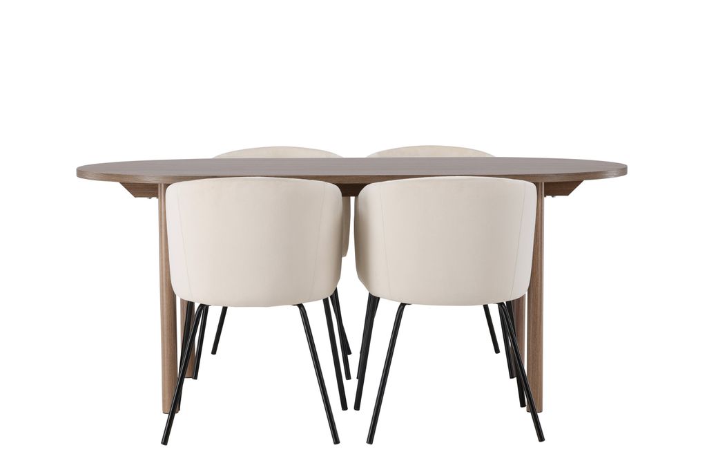 Modern matgrupp i skandinavisk stil med ovalt MDF-bord och bekväma helklädda stolar i sammet.