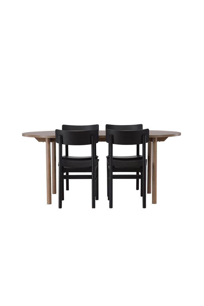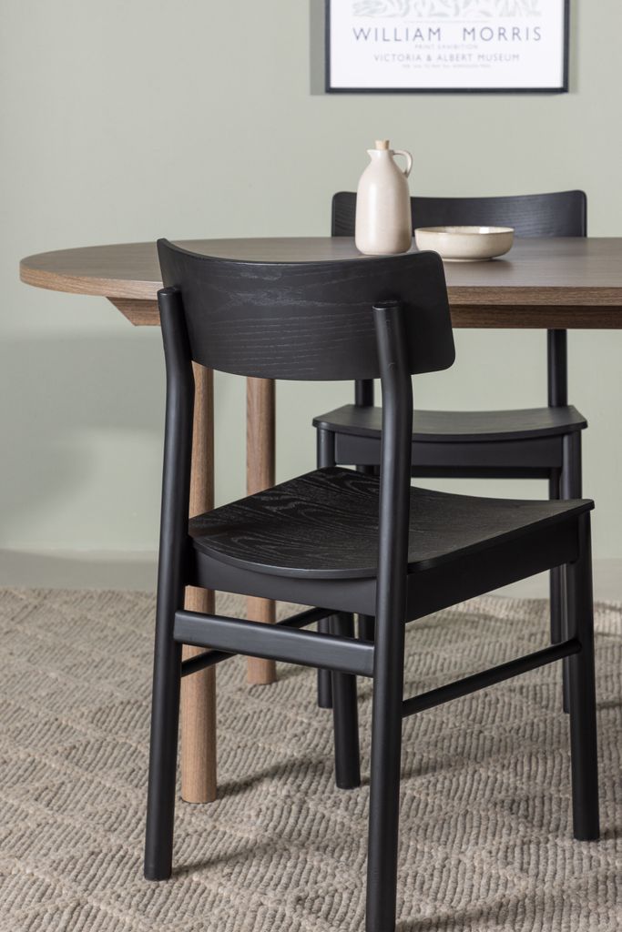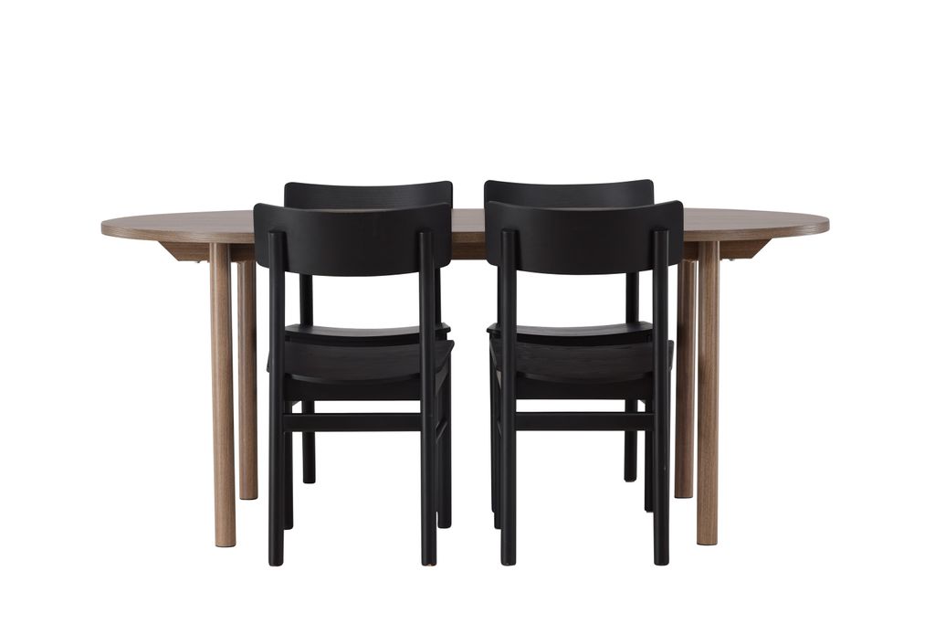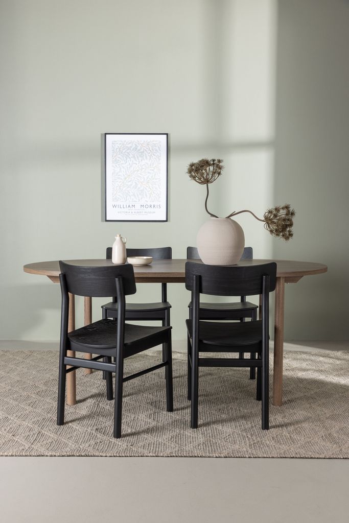 Skapa tidlös elegans med vår Venture Home Matgrupp som kombinerar det ovala bordet Andy med de stilrena Montros-stolarna. Bordet, med sina mått på 180x75 cm, har en tunn toppskiva i MDF och cylinderformade ben, som tillsammans skapar en minimalistisk och charmig design. Den mörkbruna naturfärgen ger bordet en tidlös känsla som lätt matchas med olika inredningsstilar.