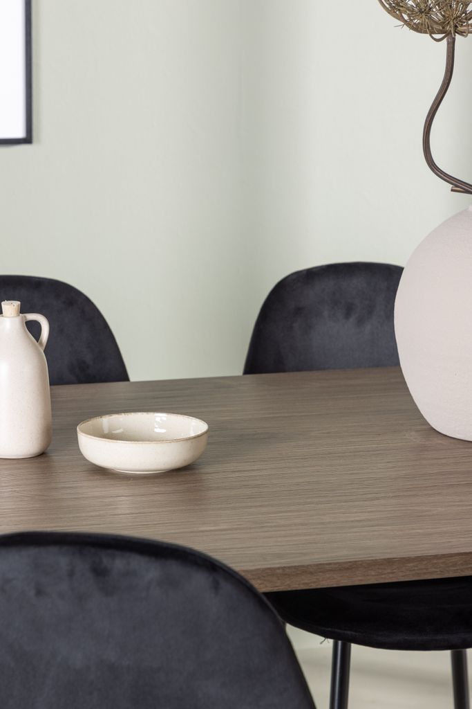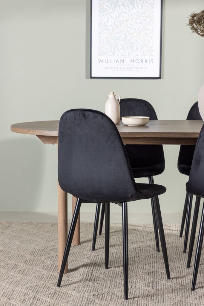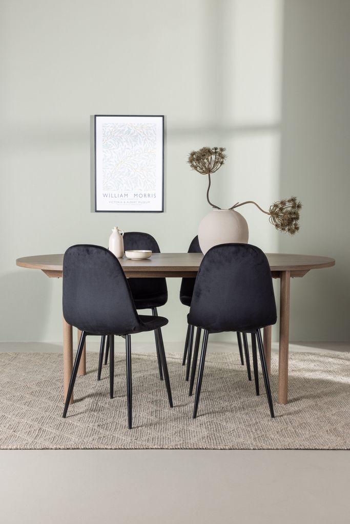 Polar stolarna är perfekt matchade med bordet och har helklädda sitsar i lyxig svart Polyester Velvet tillsammans med svarta stålben. Deras skandinaviska design ger en iögonfallande och elegant touch till matsalen, samtidigt som de erbjuder en bekväm sittupplevelse under långa middagar.