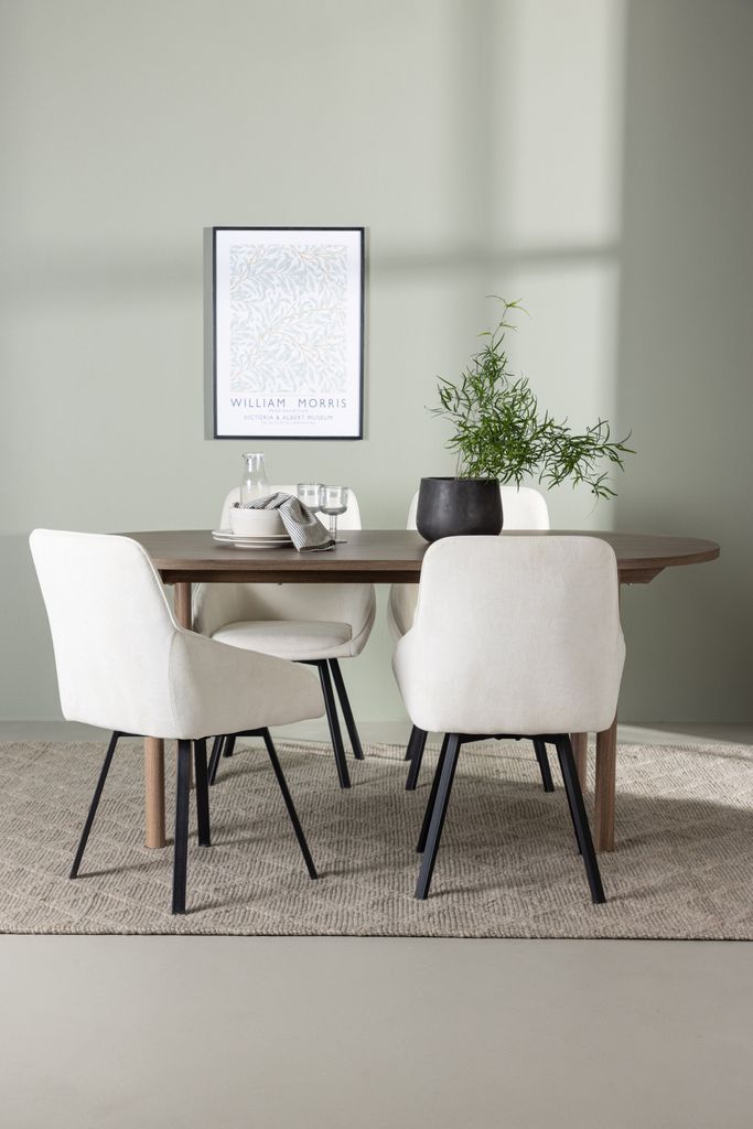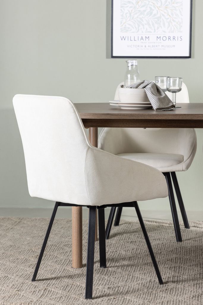 De bekväma Rosie-stolarna kompletterar bordet perfekt. Stolarna, i skandinavisk design, har helklädda sitsar i beige tyg som ger en sofistikerad touch. De integrerade armstöden erbjuder extra stöd och komfort, medan de lätt utsvängda benen i svart metall förstärker den moderna och stilrena känslan.