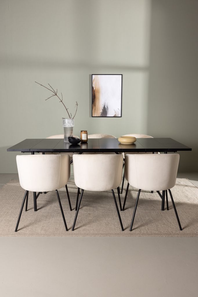 De medföljande stolarna från Berit-serien kompletterar bordet perfekt. Med sin eleganta design, lätt rundade rygg och bekväma sitsar klädda i en blandning av sammetstyg och polysterlinne, erbjuder de både komfort och stil. Stolsbenen i svart järn förstärker den minimalistiska estetiken.