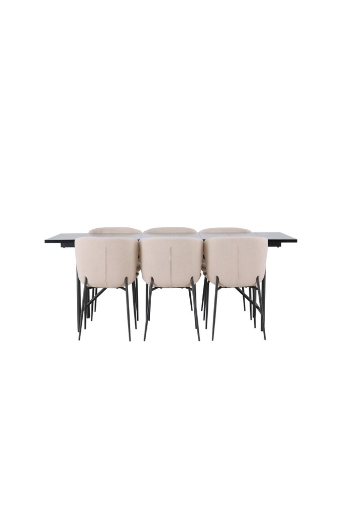 Venture Home Matgrupp Astrid med stolarna Modesto är en perfekt kombination av stil och komfort för ditt hem. Bordet Astrid har en elegant rektangulär form med en mattsvart MDF-skiva med faner, vilket ger en känsla av sofistikation. Dess smala underrede öppnar upp rummet och bidrar till en luftig atmosfär.