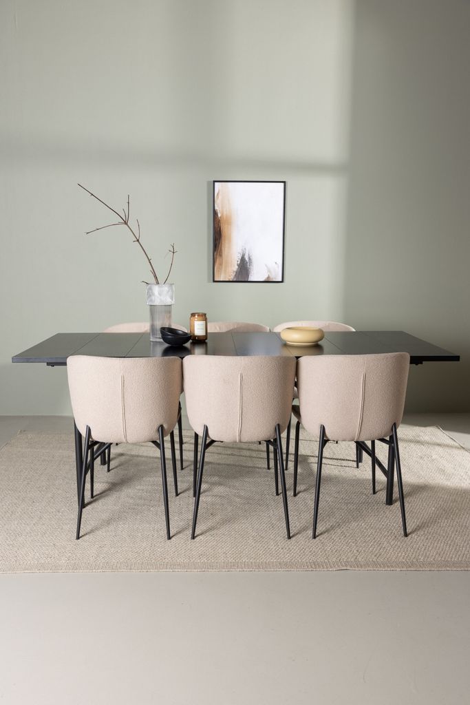 Med måtten 200x75 cm erbjuder detta bord generöst med plats för både familj och vänner. De grå stolarna Modesto har en inbjudande skandinavisk design, med mjuk grå boucleklädsel och smala svarta metallben som ger en modern touch.