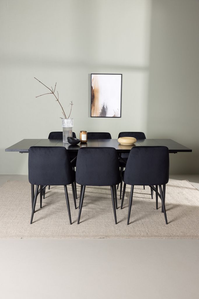 De matchande Night-stolarna är täckta i mjukt svart sammetstyg och har slanka, matchande svarta ben. Stolarnas design kombinerar komfort och stilren elegans, vilket gör dem till en perfekt följeslagare till Astrid-bordet.