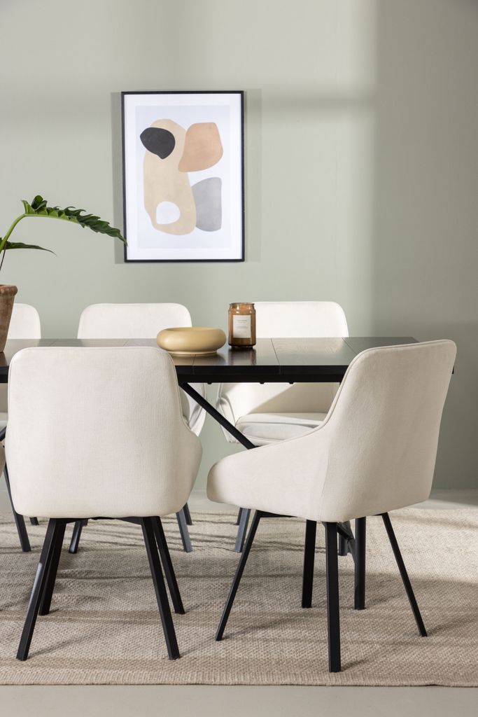 De skandinaviska designstolarna Rosie erbjuder både trend och komfort. Med en helklädd sits i mjukt beige tyg och svarta, elegant utsvängda metallben, får din matplats en modern uppgradering. Integrerade armstöd ger extra komfort för långa middagar.