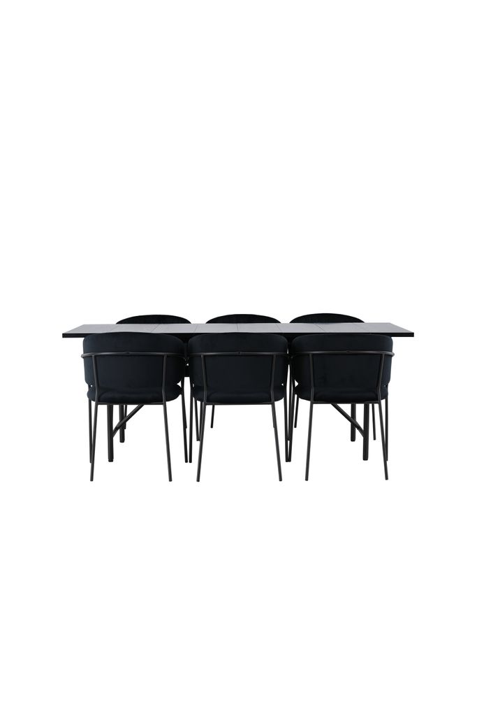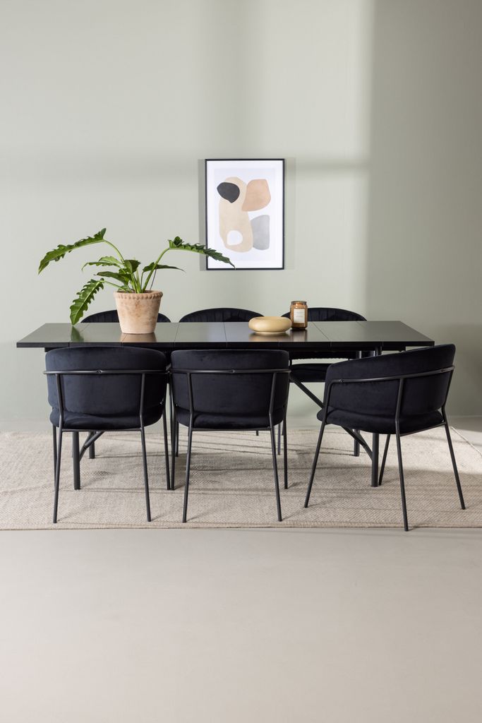 Venture Home Matgrupp Astrid med stolarna Selma är den perfekta kombinationen av modern design och hög komfort. Matgruppen består av ett sotigt svart matbord och matchande stolar som skapar en sofistikerad atmosfär i ditt hem. Bordet, med sin rektangulära, tunna, mattsvarta MDF-skiva med faner, ger en lyxig känsla och passar utmärkt för både familj och vänner tack vare sina generösa mått.