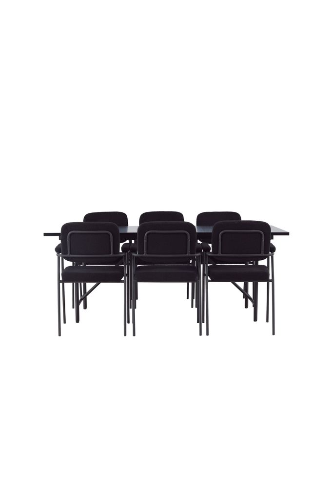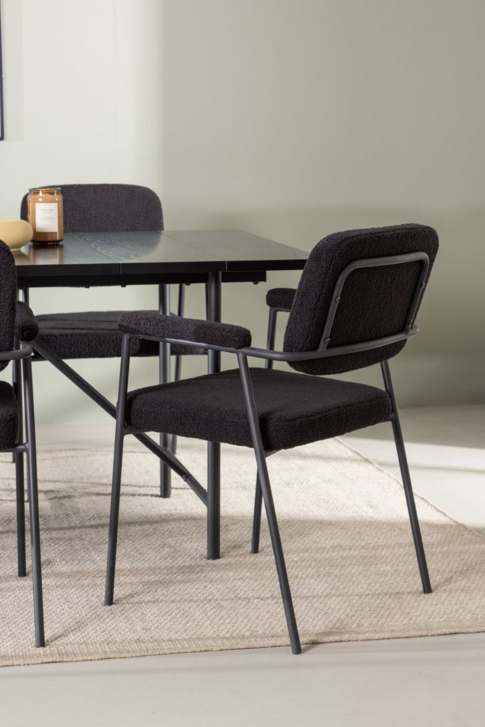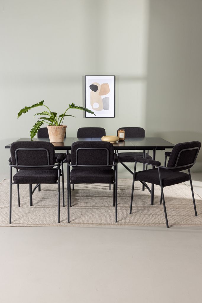 - Stolar Yesterday: Med en helklädd sits i svart bouclétyg och smala metallben, erbjuder dessa stolar både stil och komfort. De integrerade armstöden ger extra bekvämlighet under långa middagar.