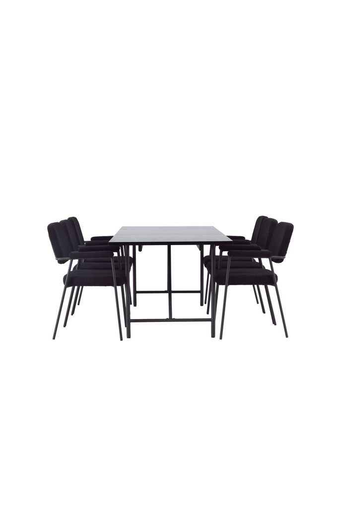 Stilren matgrupp med svart MDF-bord och boucléklädda stolar. Perfekt för minimalistisk inredning.