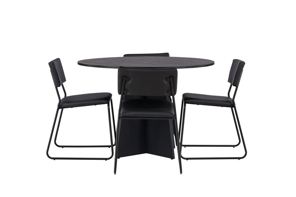 Till bordet får du fyra matstolar från Kenth-serien, designade med en luftig och modern känsla. Stolarna har både rygg och sits klädda i svart polyuretanskinn och polyester vilket ger en bekväm sittupplevelse. De dekorativa, smala stolsbenen i järn ger en stabil konstruktion utan att kompromissa med elegansen.