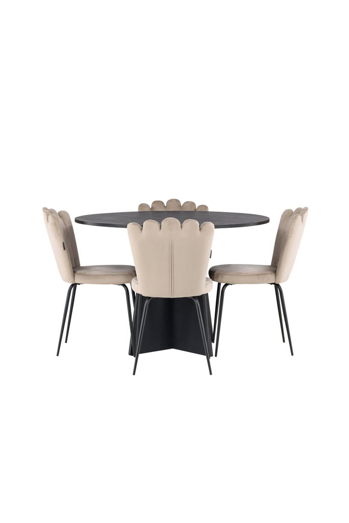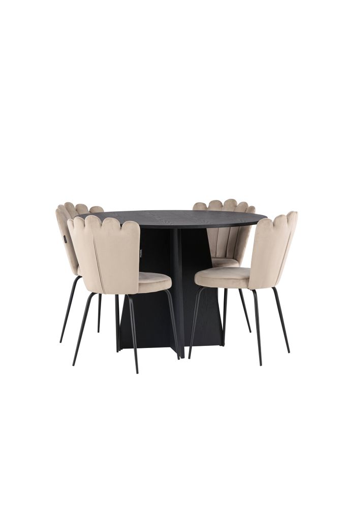 Tillsammans med bordet får du fyra av våra omtyckta Limhamn-matstolar. Stolarna har en inbjudande design med en dekorativ snäckformad rygg och dekorsömmar, vilket ger dem ett elegant utseende. Sitsen är klädd i smakfullt beige sammetstyg som kompletterar det svarta bordet perfekt.
