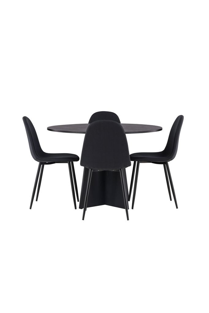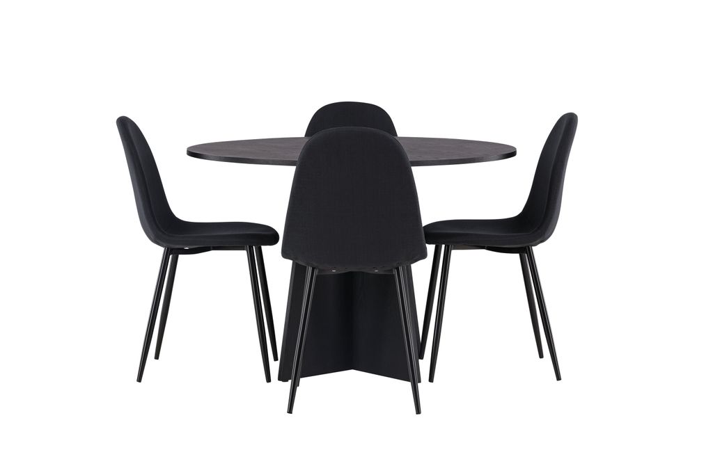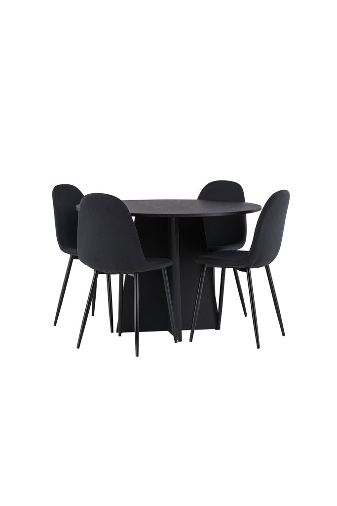 Tillsammans med bordet kommer fyra matstolar från Polar-serien, som kännetecknas av sin rundade form och klassiska design. Stolarna är stoppade med svart polyestertyg för optimal komfort, medan benen är gjorda av svart pulverlackerad metall, vilket bidrar till ett modernt utseende och hållbarhet.