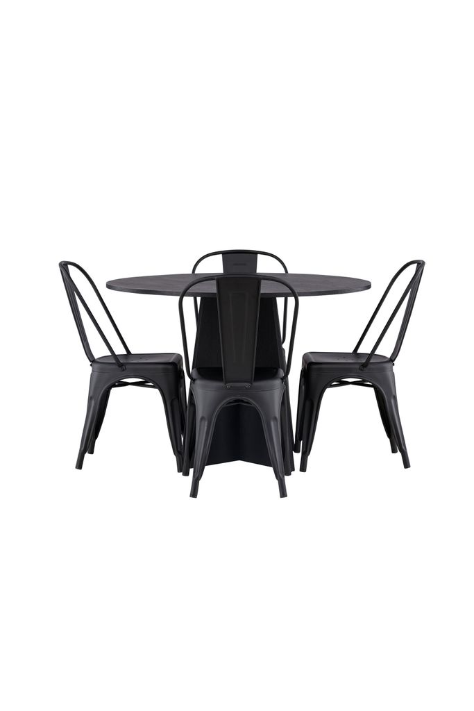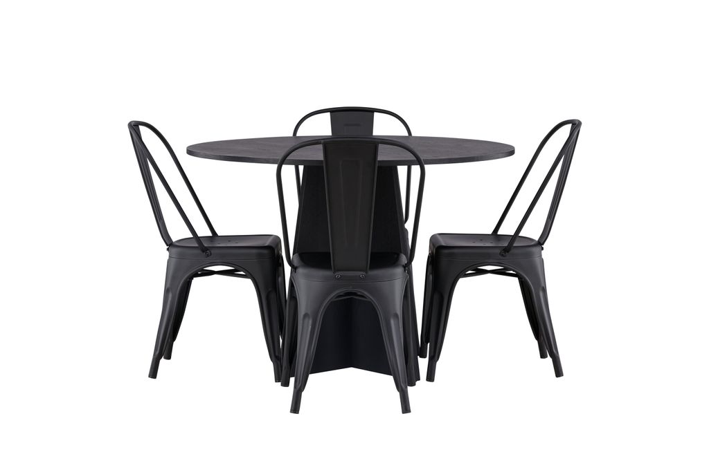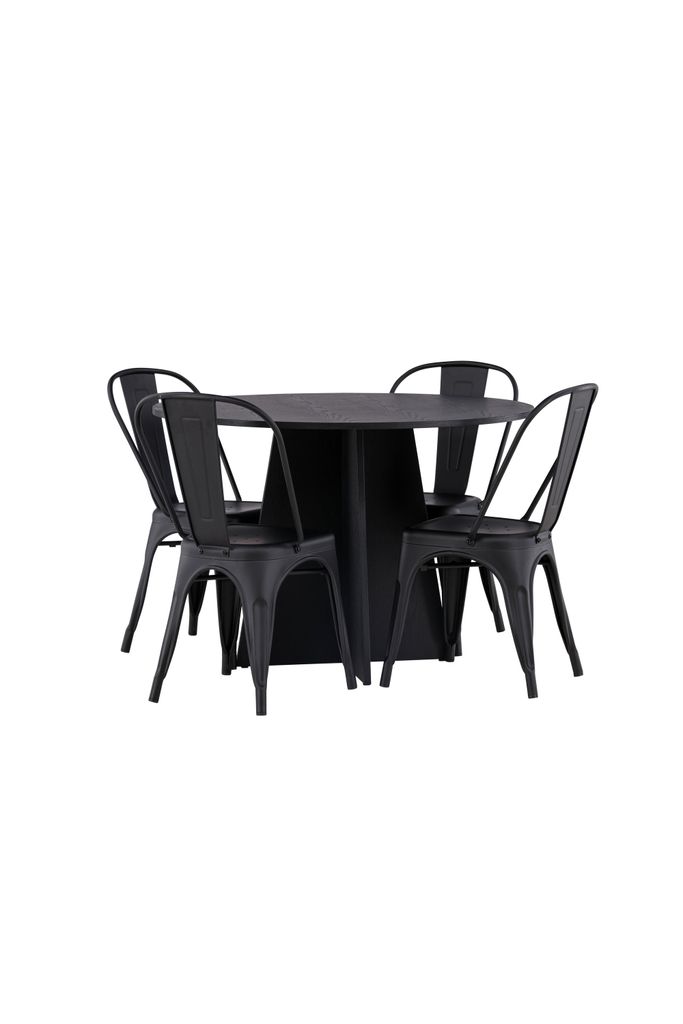 Stilren matgrupp i svart med rund bordsskiva i MDF-faner och designrik stomme, kompletterad med fyra svarta metallstolar.