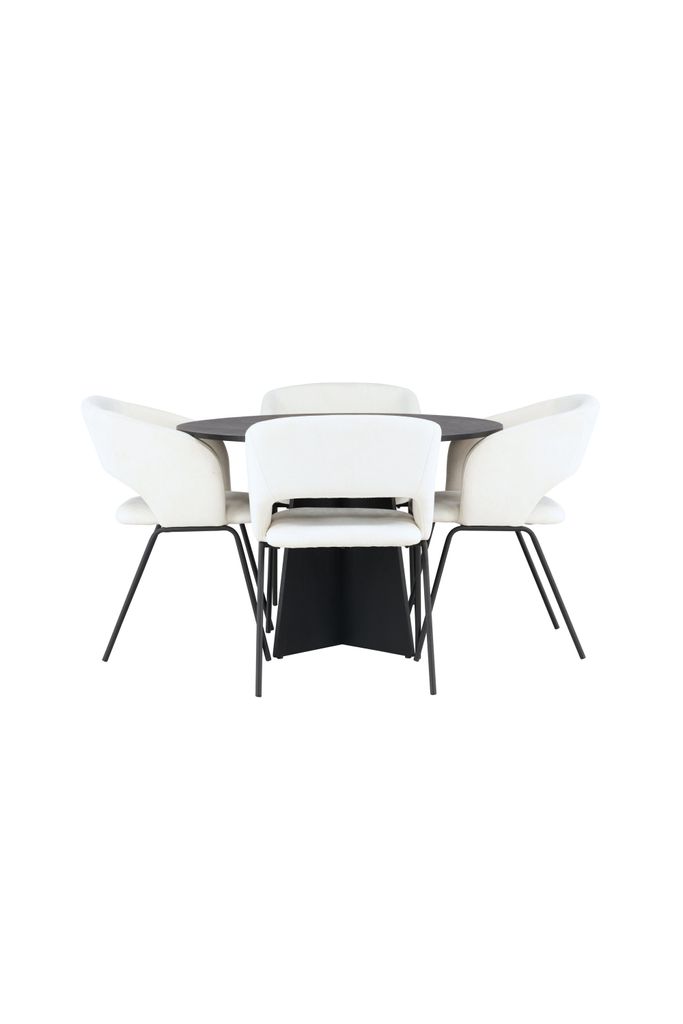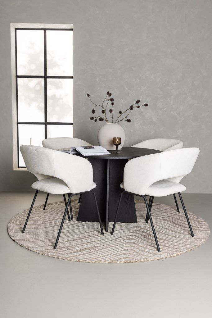 Bordet Bootcut har en rund bordsskiva i svart MDF med faner och en stabil stomme av samma material, vilket ger ett modernt och sofistikerat intryck. Med en diameter på 110 cm är det idealiskt för mindre utrymmen där alla kan sitta bekvämt.