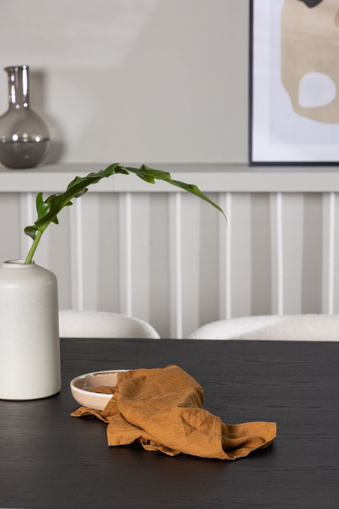 Stolarna Edina kompletterar bordet perfekt med sina helklädda sitsar i vitt boucletyg. Detta lyxiga material ger inte bara en modern touch utan också en mjuk komfort för långa middagar. De minimalistiska svarta metallbenen ger en stilren och balanserad look.