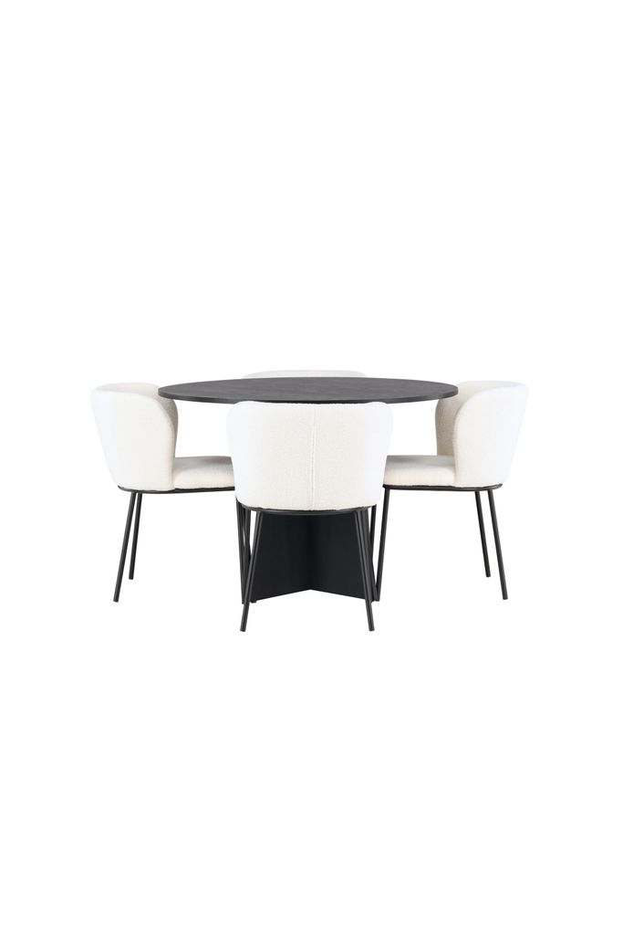 Tillsammans med bordet kommer de eleganta Edina stolarna. Deras minimalistiska ben i svart metall ger en modern kontrast till den helklädda sitsen i vitt boucletyg. Denna kombination av material ger en känsla av lyx och komfort, vilket gör varje måltid till en oförglömlig upplevelse.