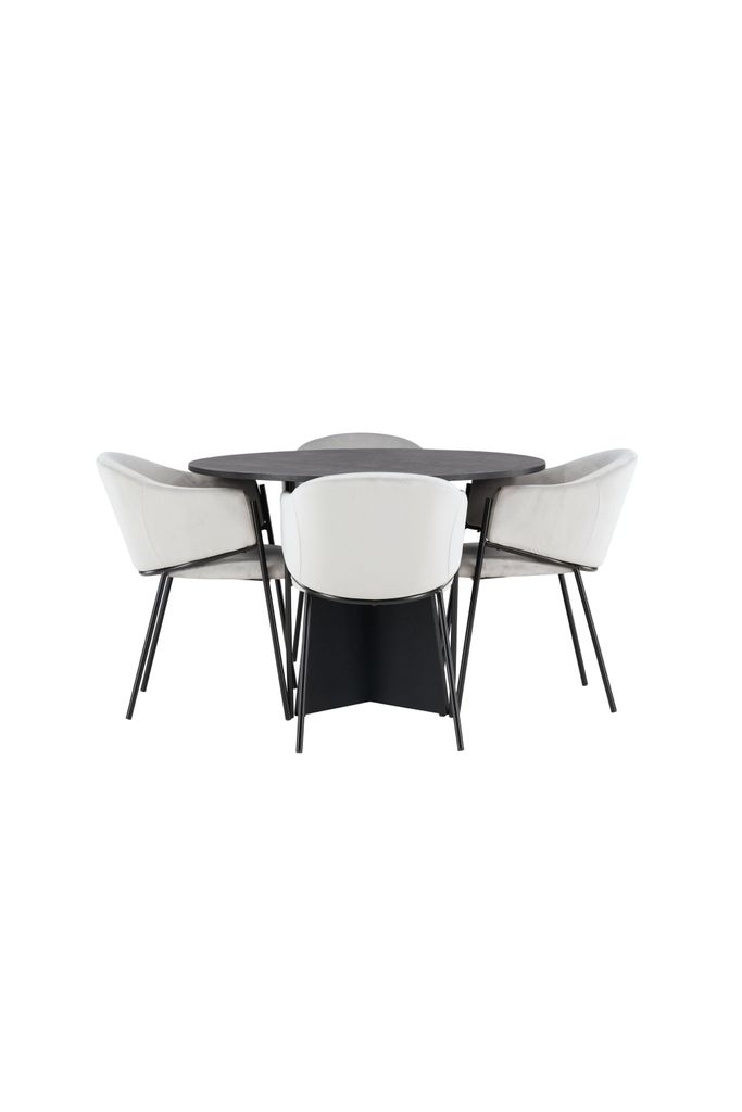 En stilren och modern matgrupp med rundat svart bord och ljusgrå stolar i sammet, perfekt för det moderna hemmet.