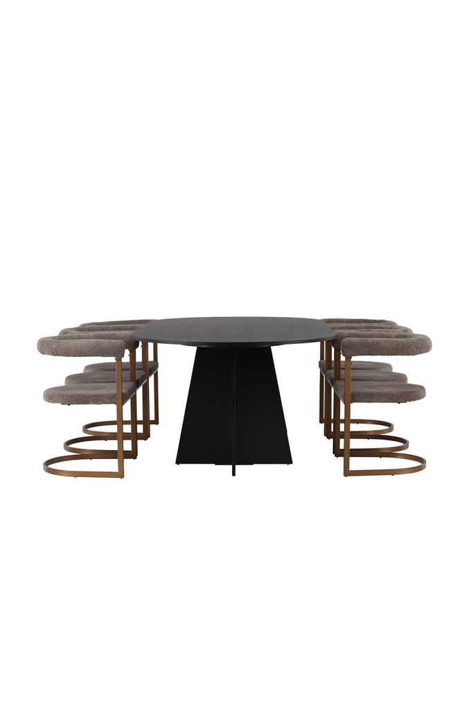 Matbordet Bootcut har en elegant oval bordsskiva i svart MDF med faner, vilket skapar en harmonisk balans mellan minimalism och design. De konformade benen i öppen design erbjuder både stabilitet och ett visuellt intryck av noggrannhet och stil. Bordet mäter 115x230 cm, perfekt för både vardag och fest.