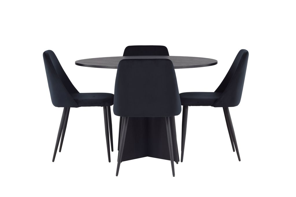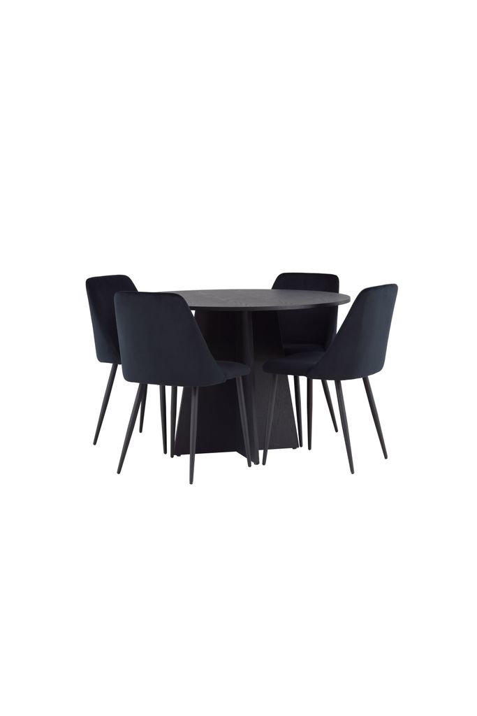 Till matbordet kommer fyra Night stolar med helklädda sitsar i svart sammetstyg. Dessa stolar erbjuder en känsla av lyx och komfort med sina mjuka texturer. De matchande svarta benen kompletterar bordets design och skapar en harmonisk helhet.