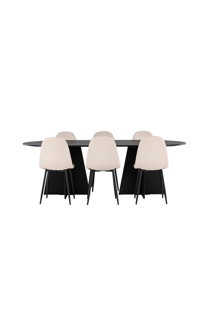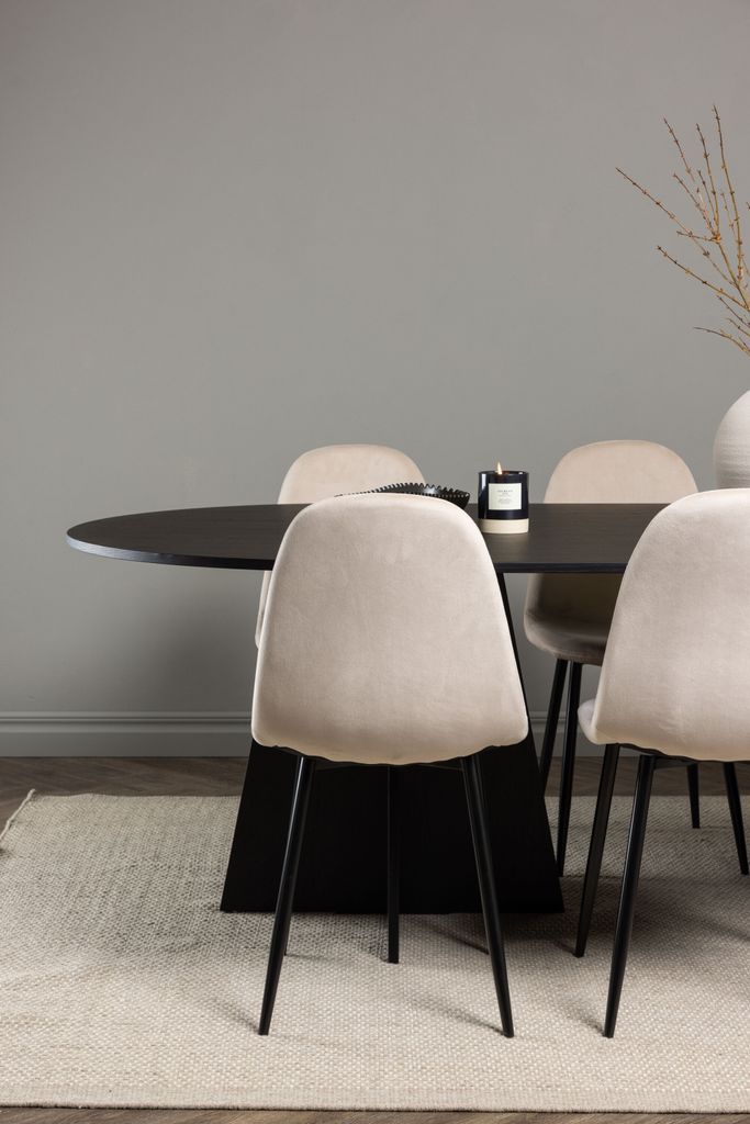 Elegant och tidlös matgrupp med ovalt bord i svart MDF och stolar i beige sammet, perfekt för stilfulla middagar.