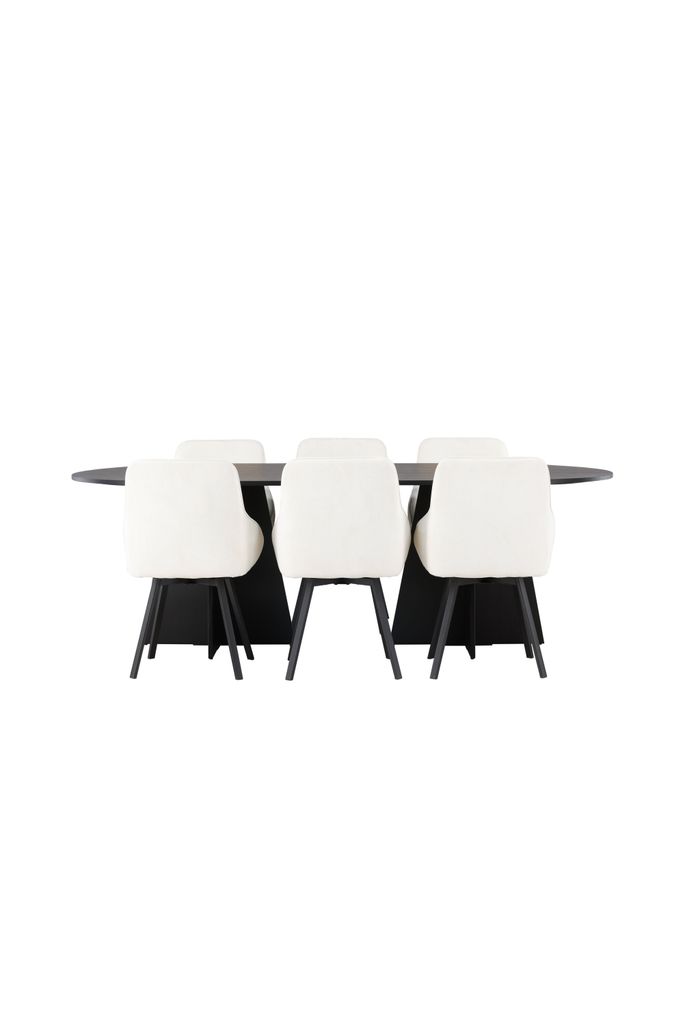 Utforska elegansen i vår Venture Home Matgrupp Bootcut, som kombinerar modern skandinavisk stil med funktionalitet. Det svartmålade ovala bordet är tillverkat av MDF med faner och har en robust design med konformade ben. Med måtten 115x230 cm ger det gott om plats för familjemiddagar och sociala sammankomster.
