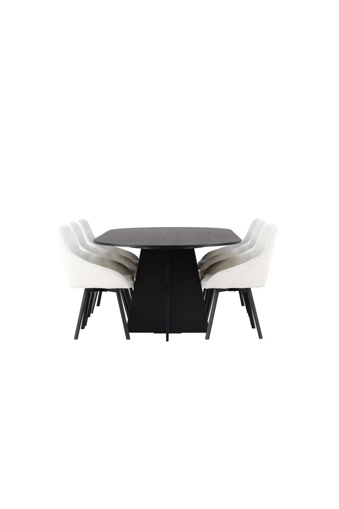 Elegant matgrupp i skandinavisk design med svart ovalt bord och beigea stolar – perfekt för modern stil och komfort.