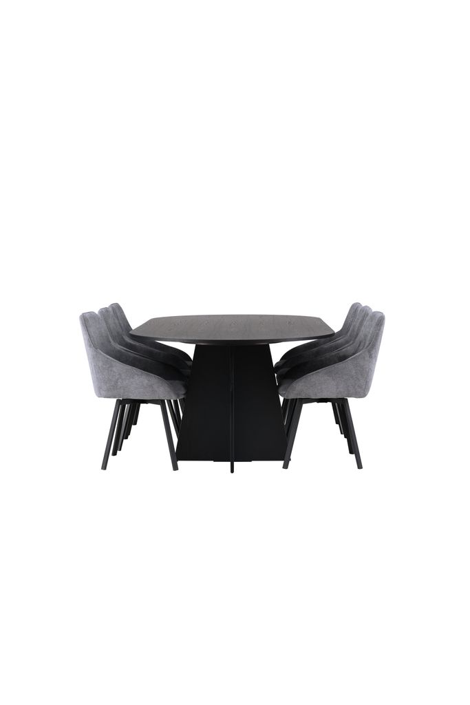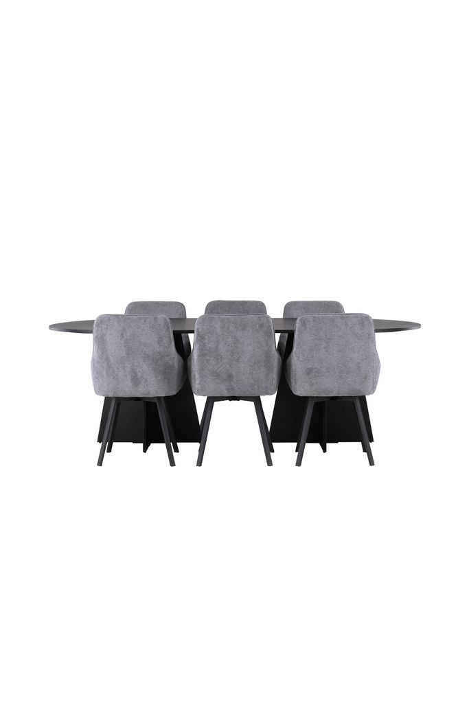 Vackert designad matgrupp i skandinavisk stil med ett ovalt svart bord och grå stolar för en elegant och bekväm måltidsupplevelse.