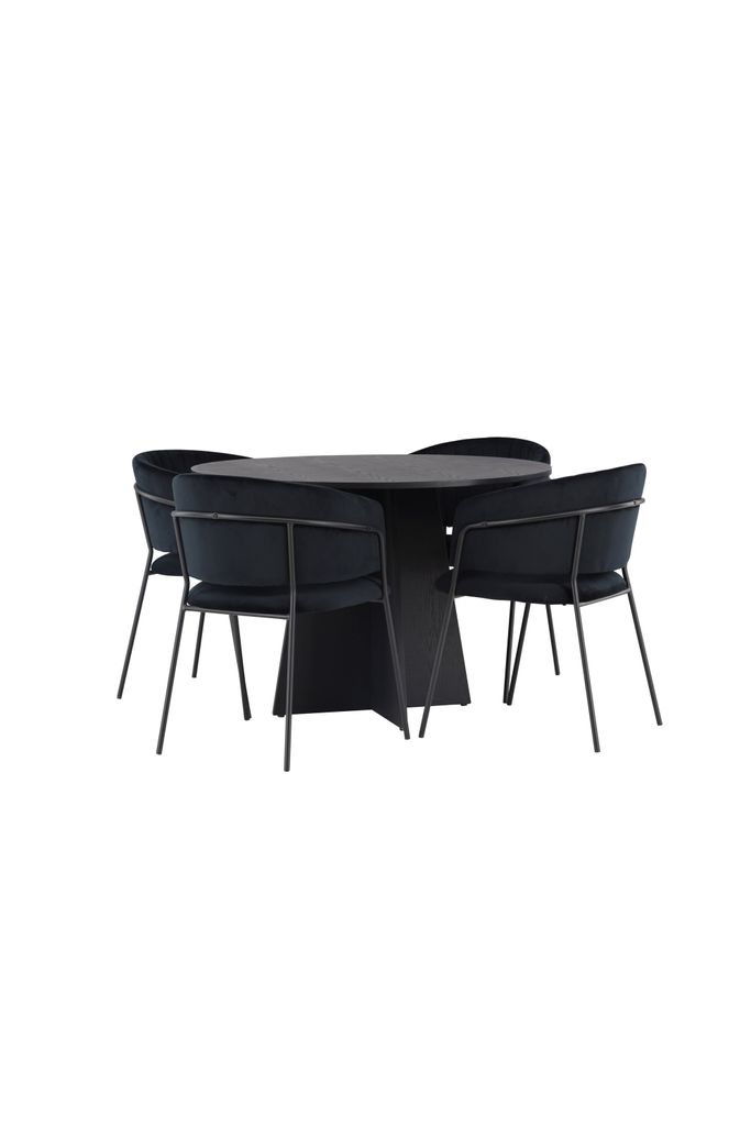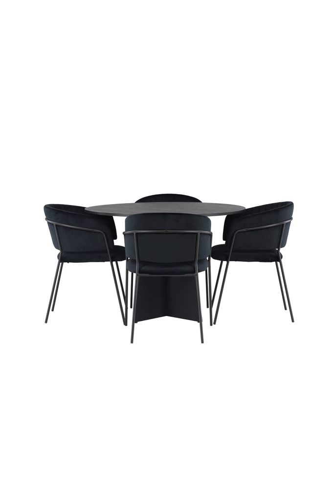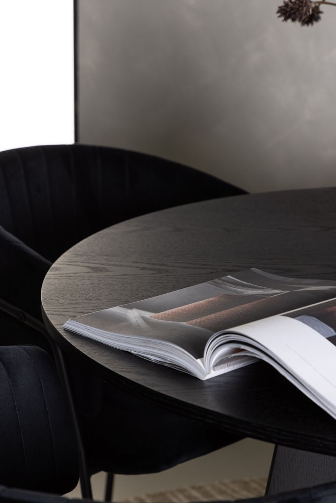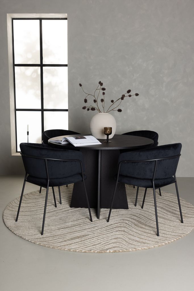 Elegant rund matgrupp med svart MDF-bord och sammetstolar. Perfekt för stilfulla middagar.