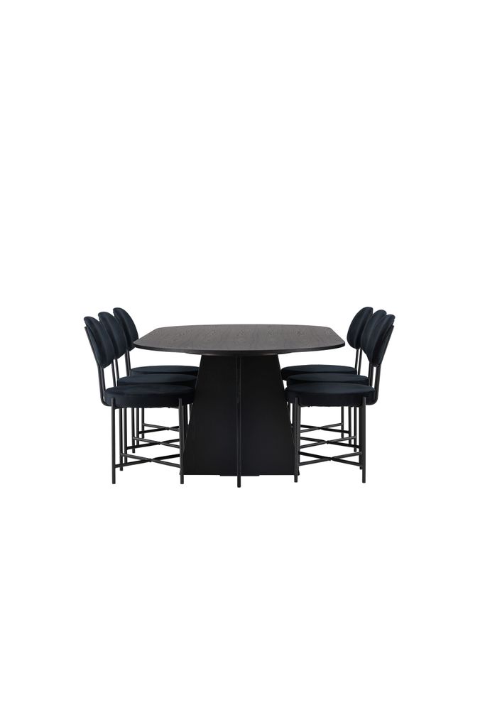 Elegant svart matgrupp med ovalt bord och stolar i sammet för en stilren och bekväm matupplevelse.