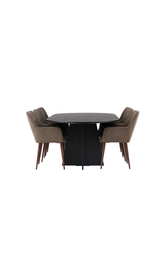 Rustik matgrupp med ovalt bord i svart MDF och bruna stolar i polyestertyg för hög komfort och stil.
