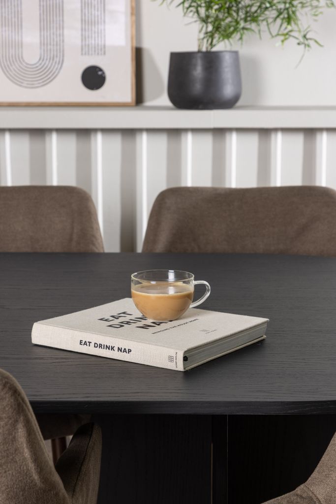 Upptäck elegansen hos Venture Home Matgrupp Bootcut med stolarna Tomorrow, en perfekt kombination av stil och komfort som förhöjer ditt matrum. Matgruppen består av ett ovalt bord med en bordsskiva i svart MDF med faner, vilket ger en lyxig och robust känsla. De två konformade benen i öppen design ger bordet en unik och modern stil, vilket gör det till en mittpunkt i varje rum.
